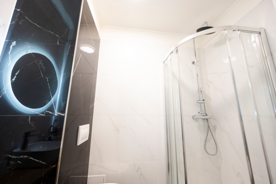 stôl, minibar, skriňa, chladnička, samostaná kúpeľňa s WC a sprchovým kútom.
